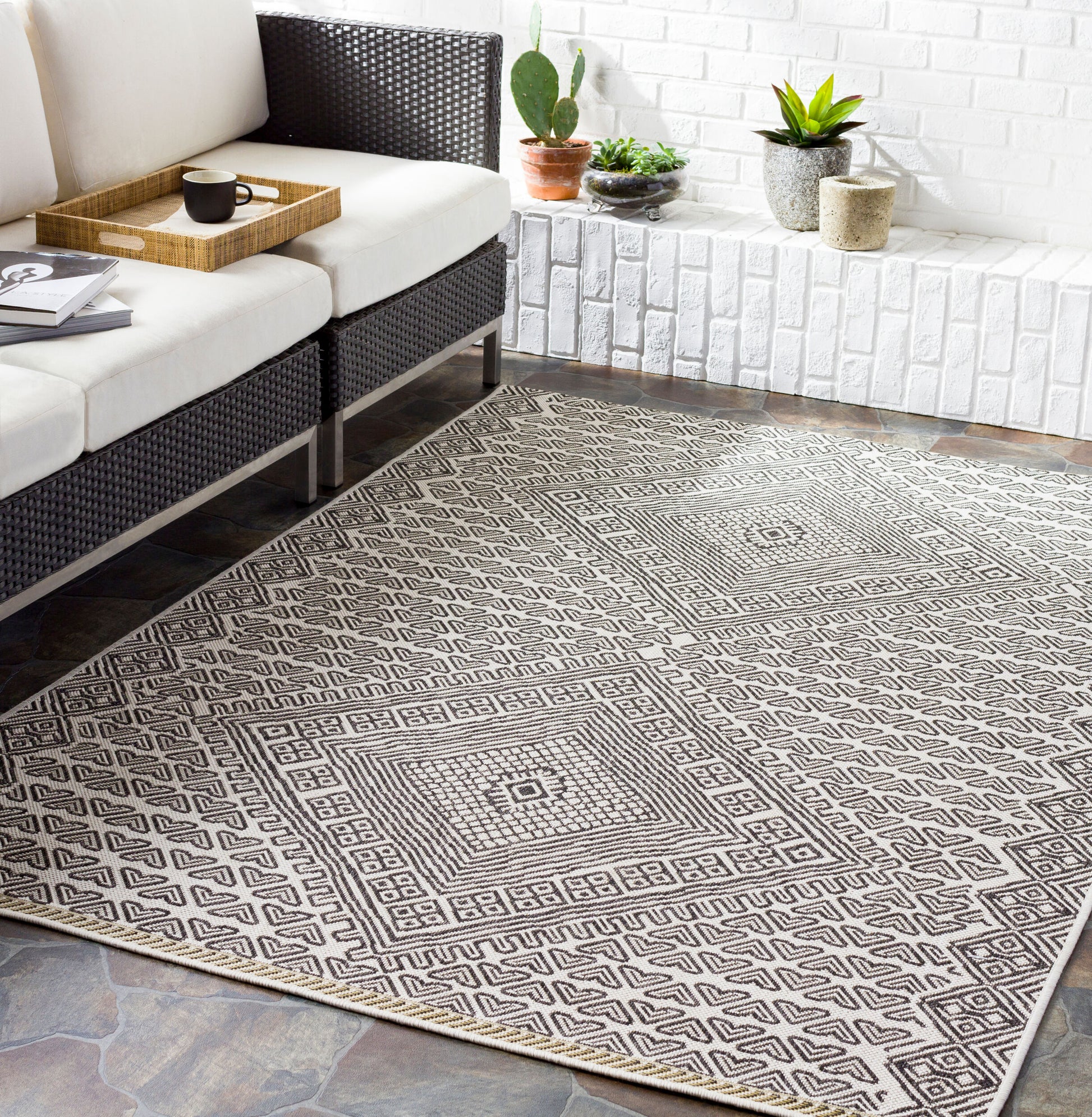 About : Completa tu espacio exterior con esta alfombra Eagean de inspiración internacional. Esta alfombra de polipropileno tejida a máquina está diseñada para soportar un alto tránsito e incluso es apta para exteriores. Fabricada en Turquía, es fácil de cuidar: simplemente enjuágala con agua y cuélgala para que se seque. Su construcción sin pelo la convierte en la opción ideal para zonas de mucho tránsito como patios y terrazas, y recomendamos combinarla con una base para mayor amortiguación. Con su estilo distintivo, esta alfombra Eagean añade el toque final perfecto a cualquier oasis exterior.